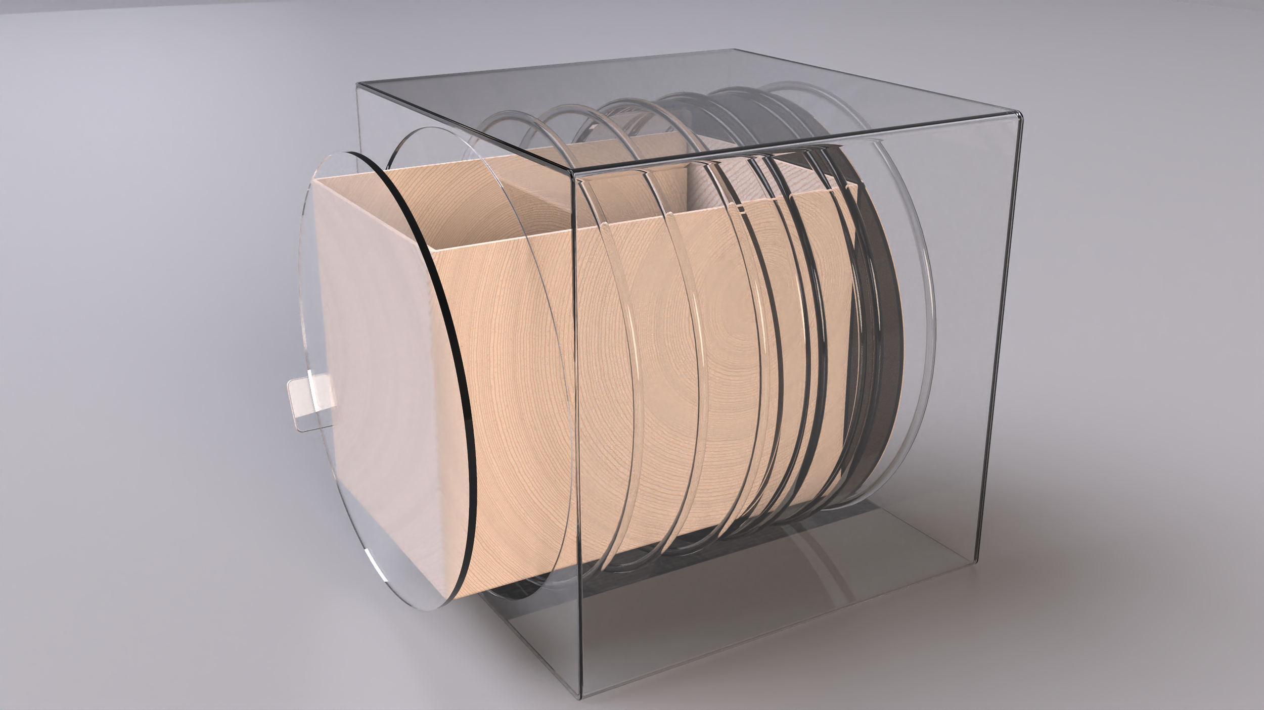Esta caja de acrílico translúcido es una interpretación del mueble modular común que forma parte de la mayoría de los hogares de todo el mundo, con la cualidad de ser independiente de su composición. Una persona tiene la capacidad de crear una atmósfera colocando estos muebles en una habitación y teniendo libertad de distribución. El sistema lock-in place brinda al propietario una posibilidad única de colocar el objeto e intercambiarlo libremente, incluso realizando nuevas composiciones reemplazando la caja interior por un material o textura diferente, dando a toda la zona una atmósfera diferente.