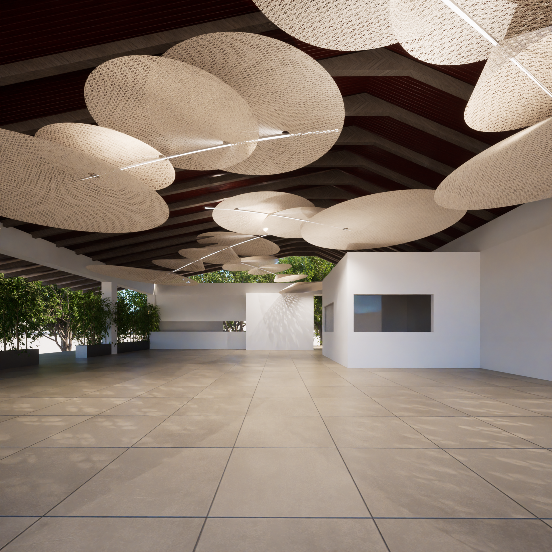 Este efecto buscamos traducir a nuestro objeto imaginado. Una rama colgante en el espacio en donde se logra tener una luz de rebote que es generada desde las hojas construidas para no ser solo difusores, sino filtros. Buscamos construir una atmósfera de selva dentro de un ambiente controlado, en donde al percibir de donde viene la luz, tengas un rastro de donde estas y en que contexto se encuentra tu ser.