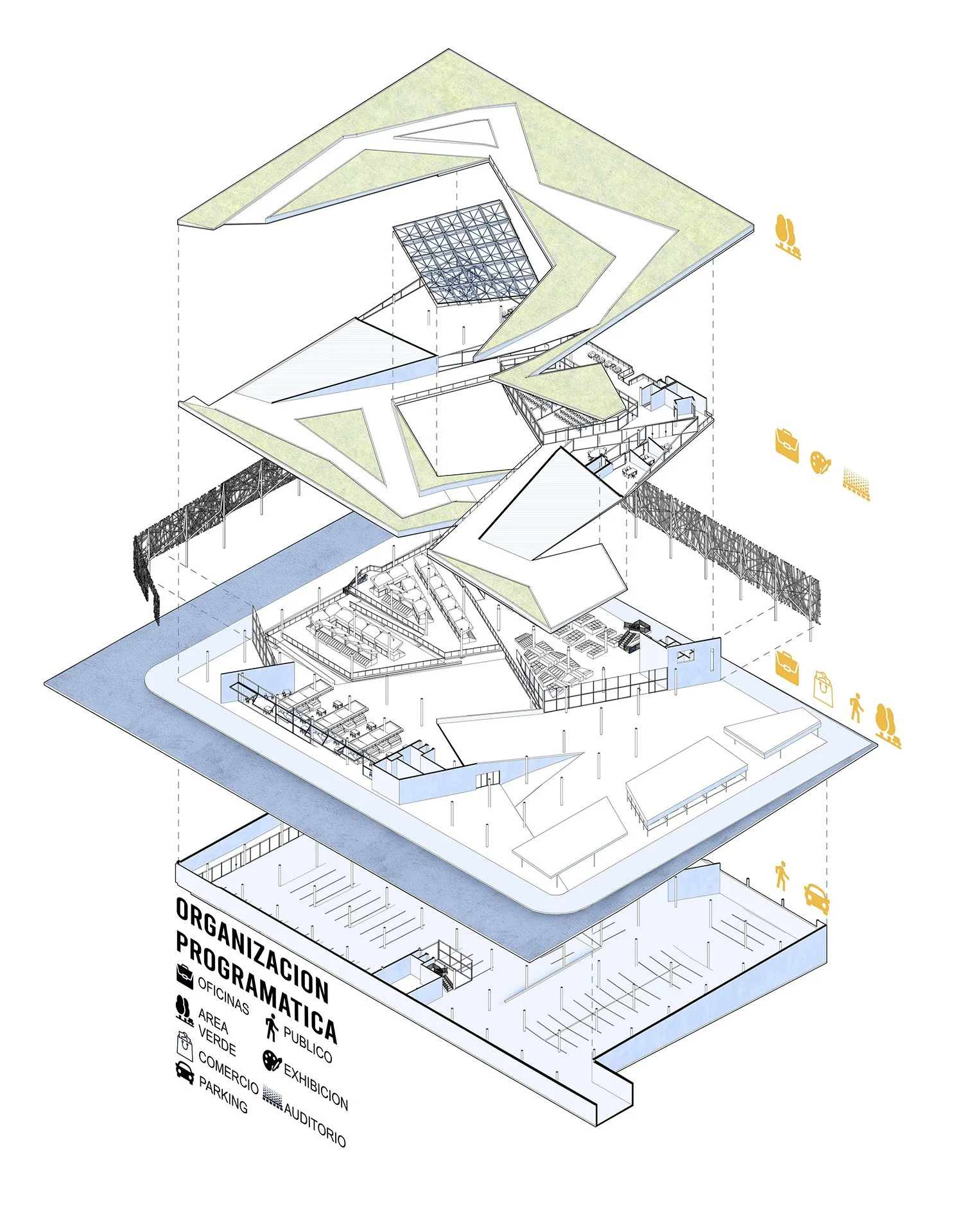 El concepto del pliegue espacial es la estrategia de distribución programática y se traslapa con la espacialidad del edificio, este pliegue es usado como una guía de circulación y experiencia del usuario que descubre como una analogía el proceso y uso de los productos desde su estado natural hasta su estado procesado como un plato de comida. Un edificio que muestra la raíz gastronómica de la cultura.