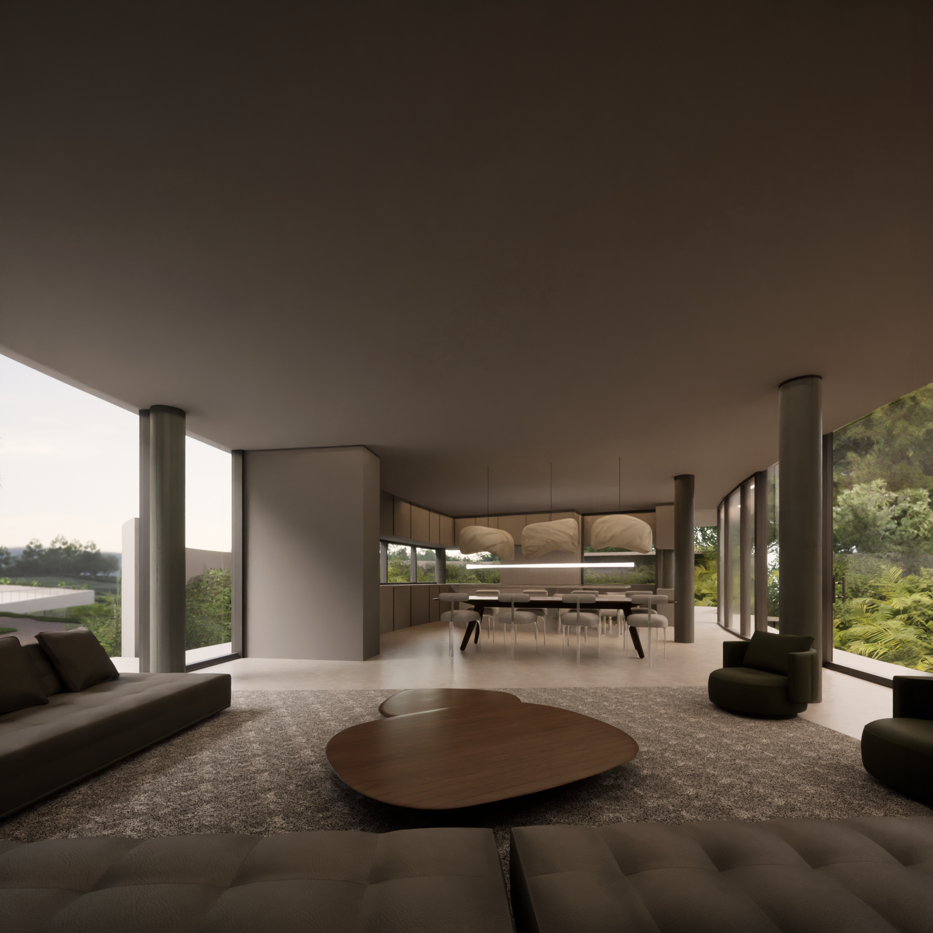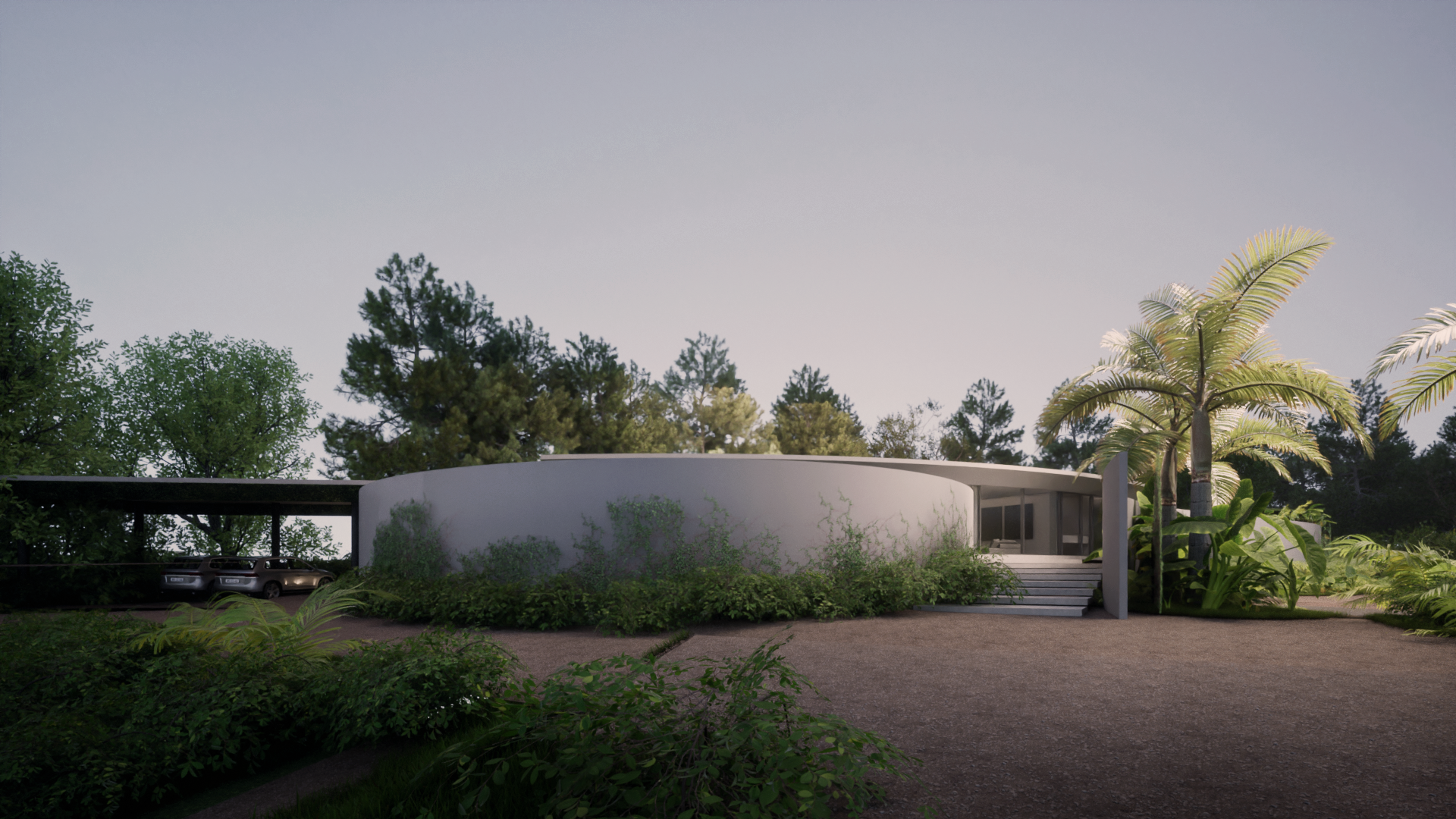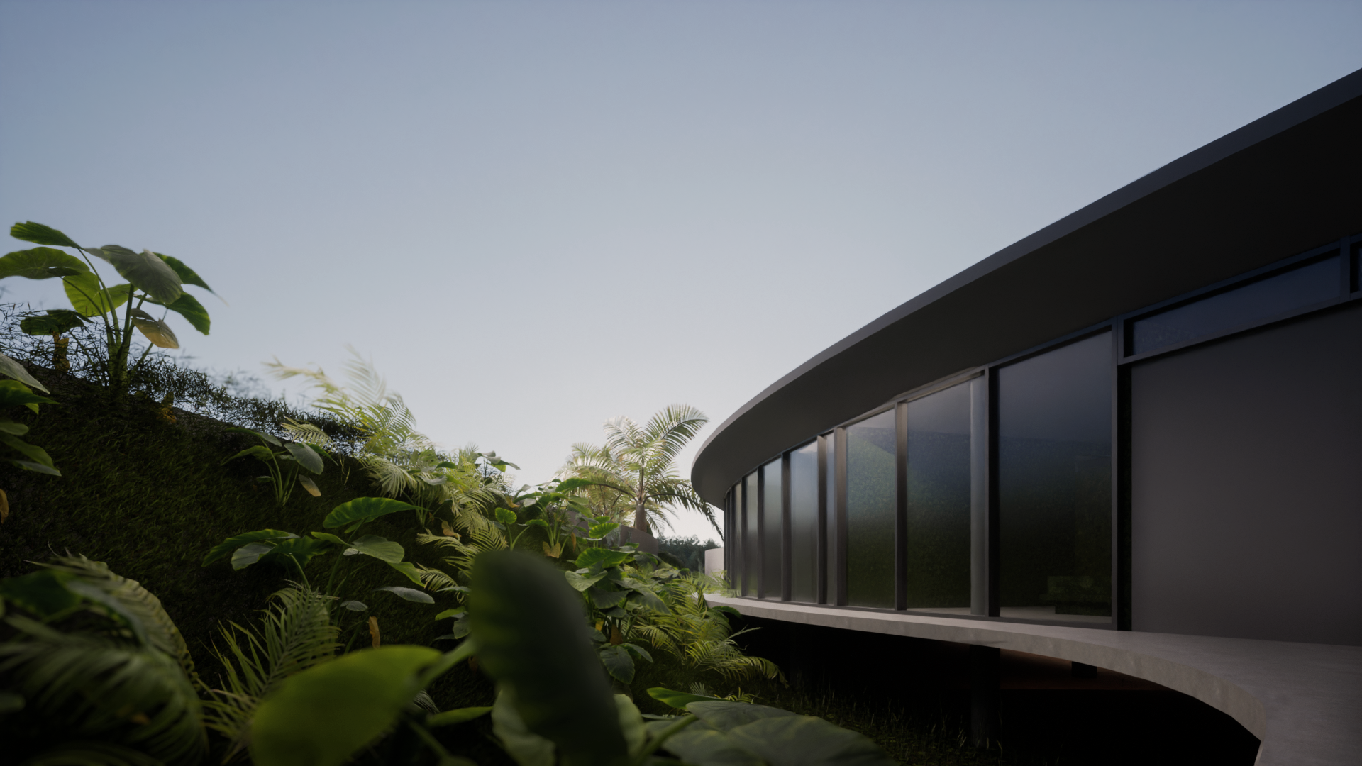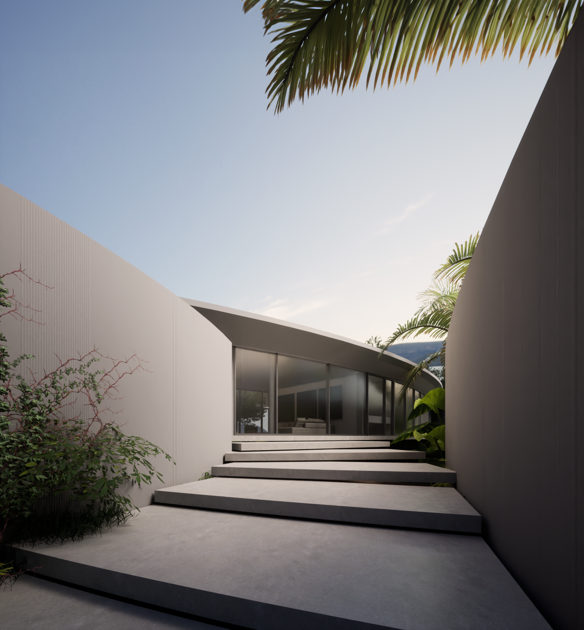 La residencia de una sola planta se alza como un elemento desprendido del contexto de selva. Buscamos mantener un límite marcado de conexión visual desde el perímetro exterior para garantizar la privacidad del cliente, al mismo tiempo crear atmósferas contenedoras que sean el punto de enfoque del usuario al ingresar al proyecto y perder la ilusión de barrera de los muros de privacidad.