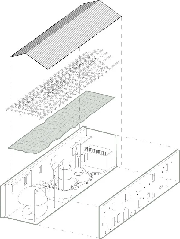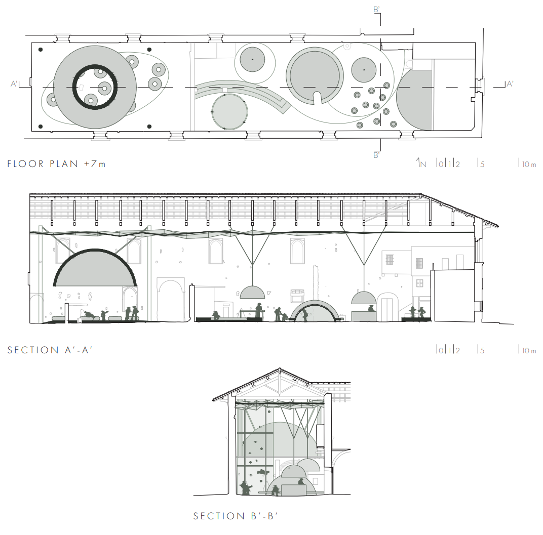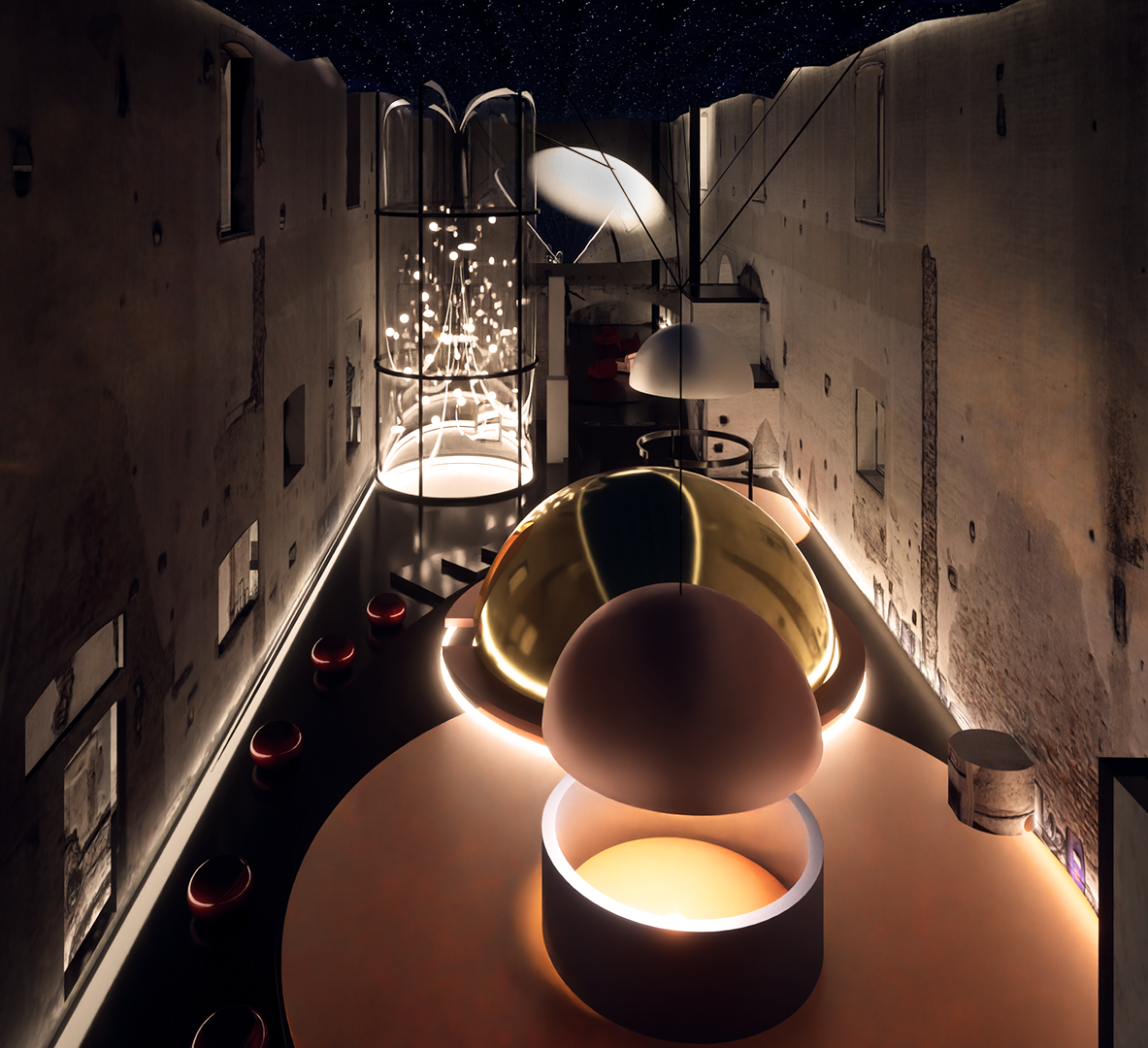 El proyecto consta de seis estaciones inmersivas conectadas por un camino en a penumbra que guía su recorrido. La oscuridad del edificio se utilizó para crear un ambiente temático que proyecte el universo en un interior sin espacialidad limitada. La primera estructura abovedada se utiliza como mostrador de información en el acceso. Avanzando, llegas a un escenario que se puede utilizar para diversas actividades, incluso para reuniones culturales de los ciudadanos de Cusago.