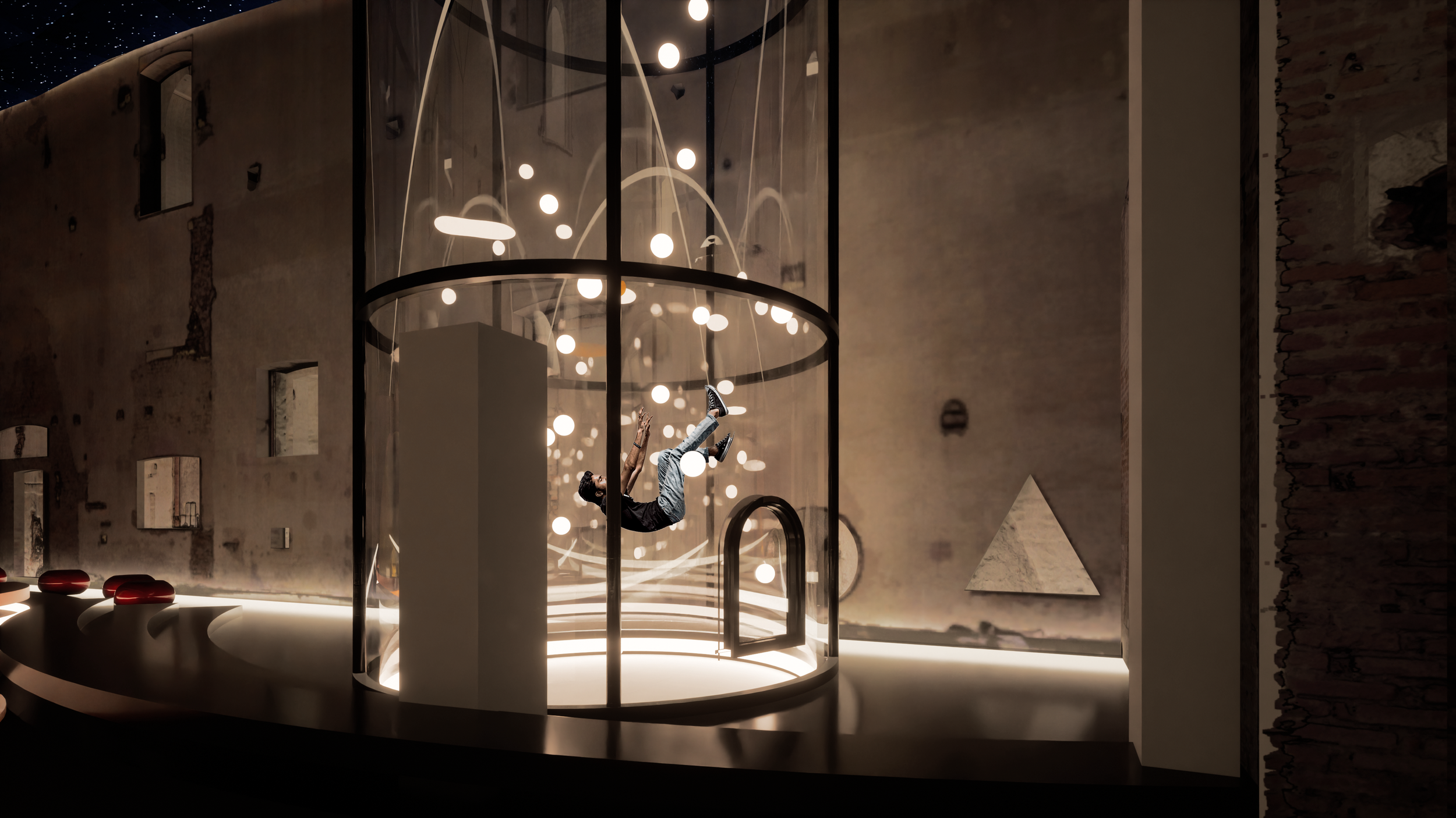 El primer espacio de exhibición está dentro de una esfera de estructura de acero con bancos alrededor para contemplar la realidad aumentada proyectada en el interior. Avanzando, llegas al tubo transparente donde puedes experimentar la gravedad cero. Justo al lado, la pequeña cúpula suspendida muestra proyecciones de diferentes tipos de realidades y ficción. Finalmente, al llegar a la segunda sala, comienza el viaje con una gran cúpula que funciona como planetario.